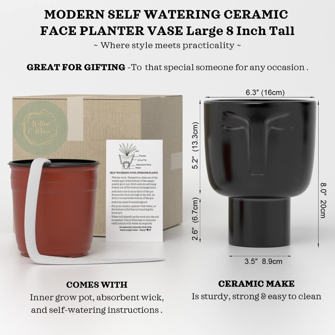 Amazon Com Willow Muse Large Face Flower Pot Self Watering Black Ceramic Planter Face Planter With Inner Pot Head Planter Or Ceramic Face Vase Face Planters Pots Head Vase 8